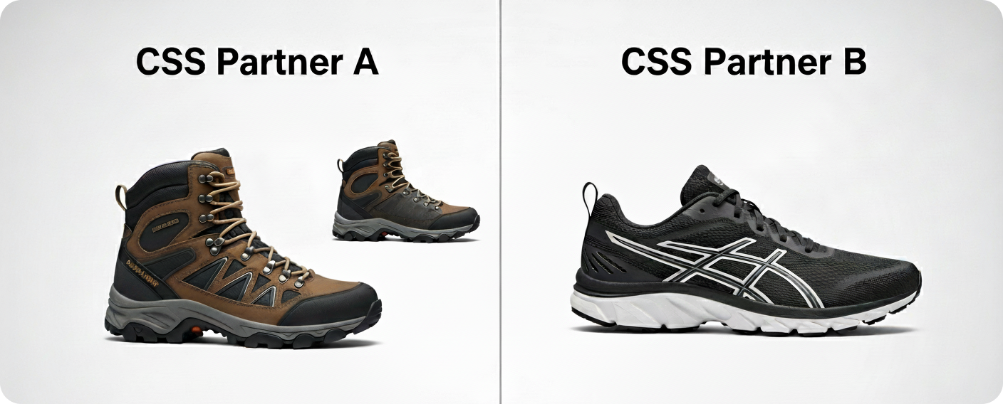 - CSS A aj CSS B propagujú rovnaké turistické topánky