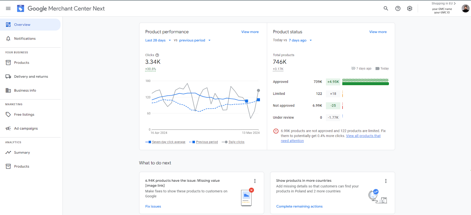 Vďaka tejto novej sekcii, už nemusíte prepínať medzi e-mailovou schránkou a rozhraním Merchant Centra. Informácie o zamietnutých produktoch, problémoch s feedom či odporúčania na zlepšenie sa vám zobrazia hneď po prihlásení, a to prehľadne, na jednom mieste a v reálnom čase.
