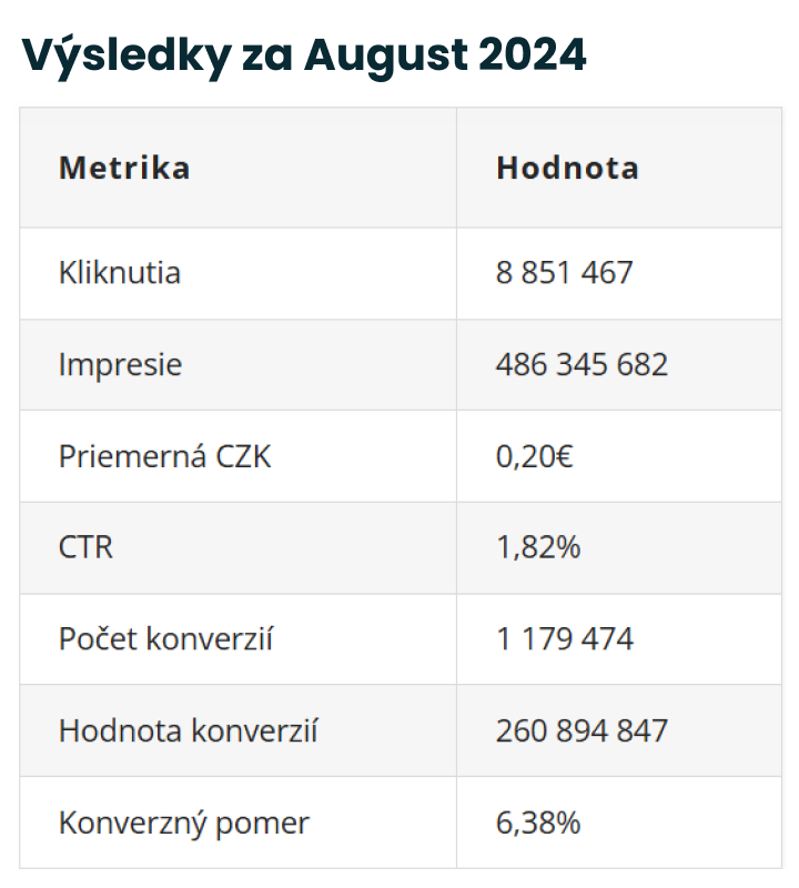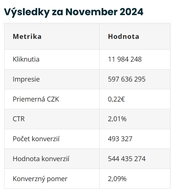 Najvýraznejší nárast v počte konverzií nastal v septembri, kedy konverzný pomer dosiahol hodnotu až 13,04%. V októbri sme síce zaznamenali mierny pokles konverzného pomeru, no zároveň sme pre klientov dosiahli významný nárast samotnej hodnoty konverzií. Okrem toho sa zvýšili aj hodnoty CTR, ako aj počet kliknutí a impresií, čo naznačuje, že aj pri menšom poklese konverzného pomeru sme udržali silný výkon a efektivitu kampaní.