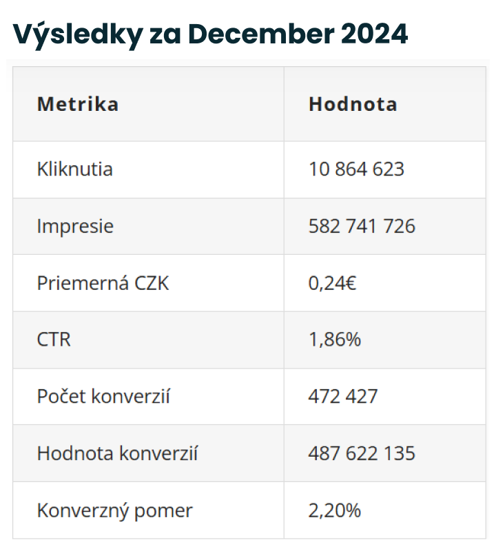 - CTR: CTR malo rastúcu tendenciu, začínajúc na 1,80 % v júli, s postupným nárastom na 2,01 % v novembri. V decembri došlo k miernemu poklesu na 1,86 %.