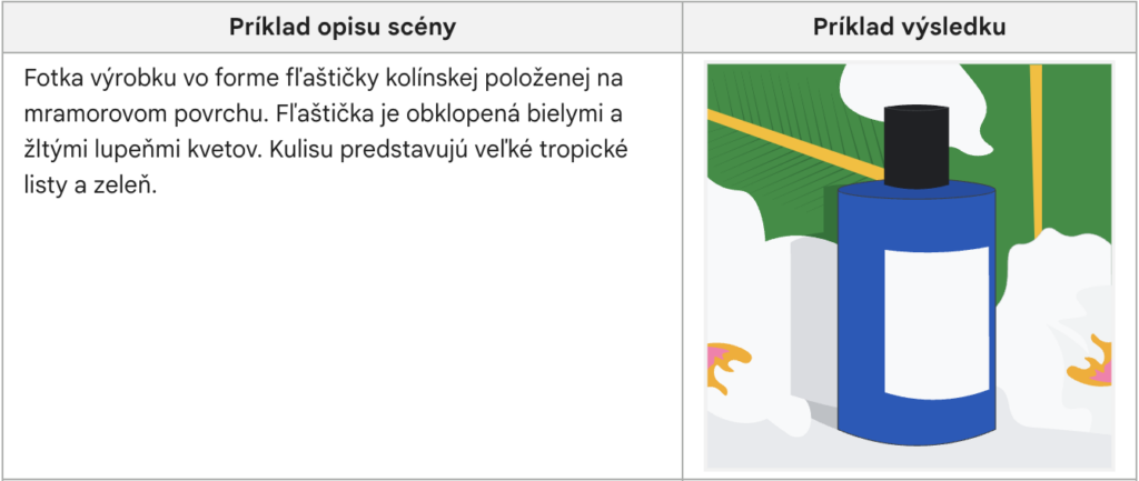 Aby ste dosiahli čo najlepšie výsledky aj prostredníctvom opisu scény, zamerajte sa na – štýl obrázka, pozadie, typ, umiestnenie a scénu okolo výrobku.