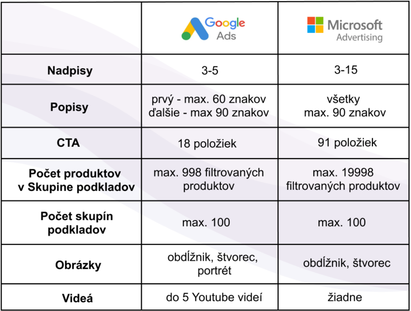 Ako vidíme, rozdiely spôsobujú mierne odlišnú štruktúru v kampaniach Performance Max v rámci Google či Microsoft Ads. Napríklad, do Performance Max kampaní pre Google môžete zahrnúť aj YouTube videá, čo nie je možné v prípade kampaní Performance Max v Microsoft Ads. Ďalším rozdielom, ktorý si môžeme všimnúť, je aj používanie textov, ako napríklad v nadpisoch a popisoch reklám. Najvýraznejší je však rozdiel v spôsobe, akým sa produkty delia do skupín produktov. V prípade Performance Max kampaní v Google Ads môže byť do každej skupiny produktov zaradených maximálne 998 produktov, čo znamená, že pri väčších kampaniach je nutné vytvoriť viaceré skupiny produktov. Naopak, v prípade Performance Max kampaní v Microsoft Ads sa do jednej skupiny produktov zmestí až 19 998 produktov.