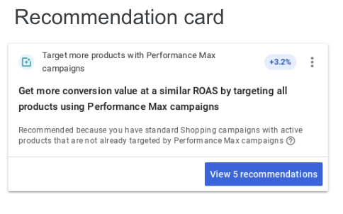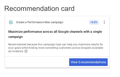 ukážka tzv. "odporúčacej karty" na vytvorenie PMax kampane v rámci optimalizácií kampaní v Google Ads
