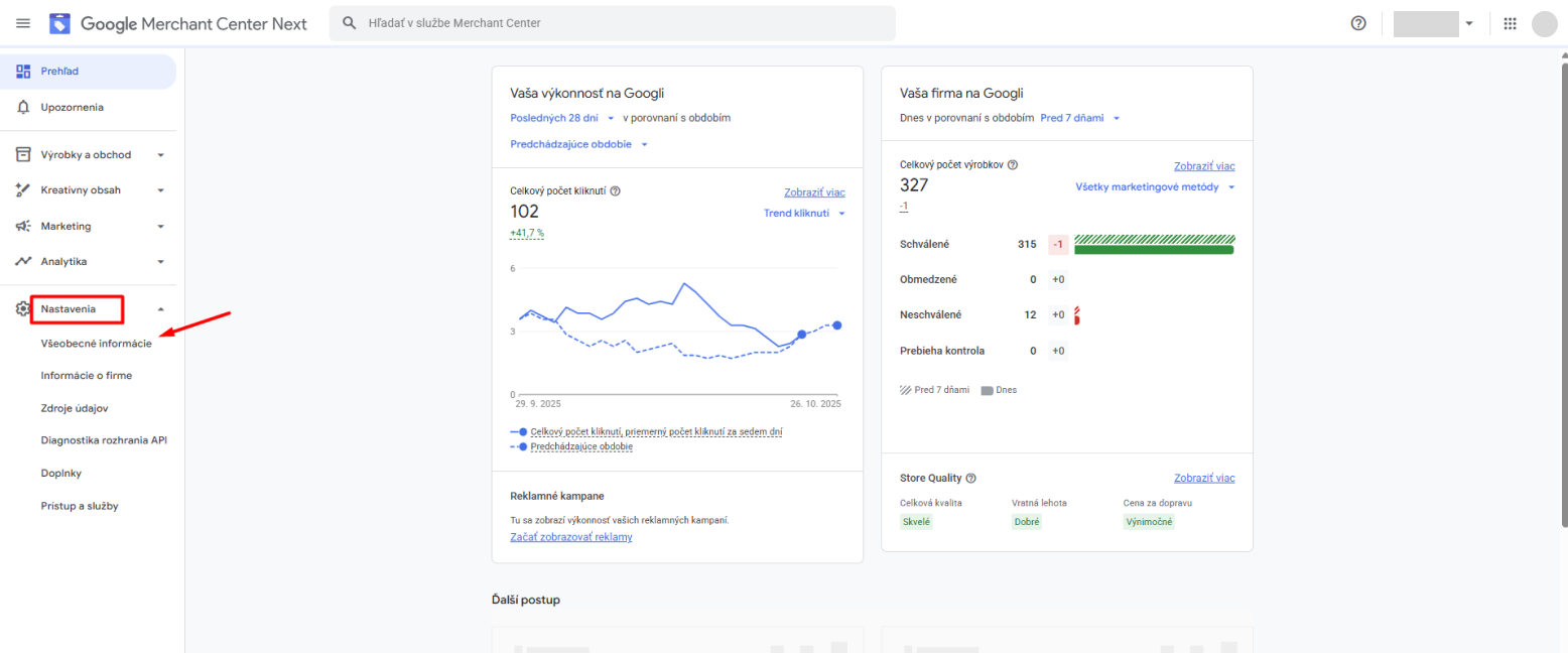 1. Najskôr sa prihláste do svojho účtu Google Merchant Center Next. Po prihlásení prejdite do sekcie Nastavenia, kde kliknete na možnosť Všeobecné informácie.