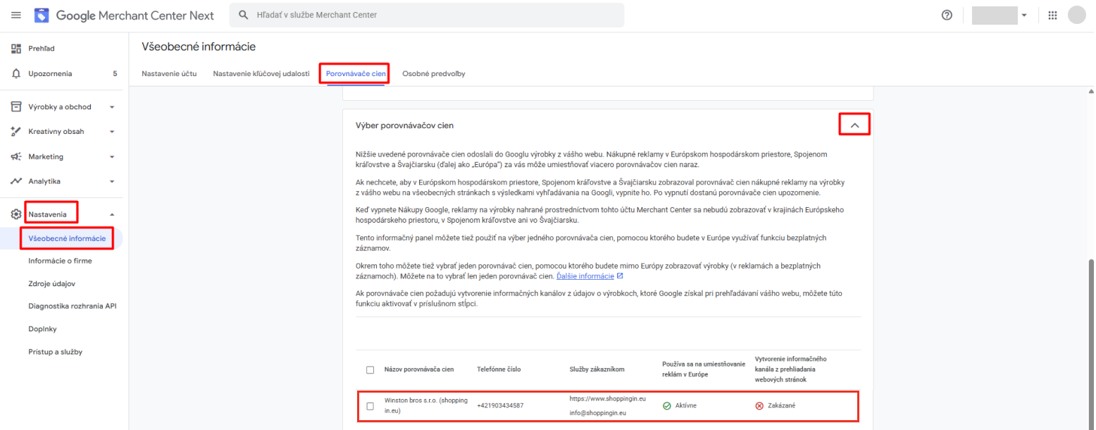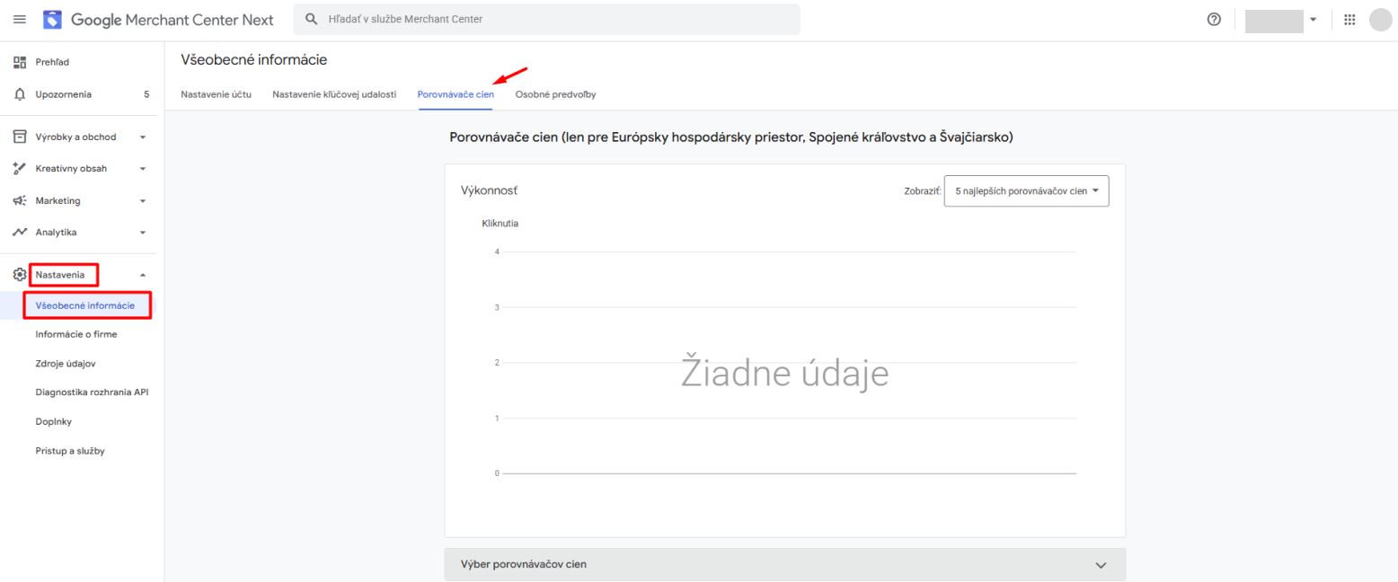 V rámci Všeobecných informácií zvoľte možnosť Porovnávače cien. Táto sekcia vám poskytne nástroje na správu služieb CSS, ktoré aktuálne využívate.